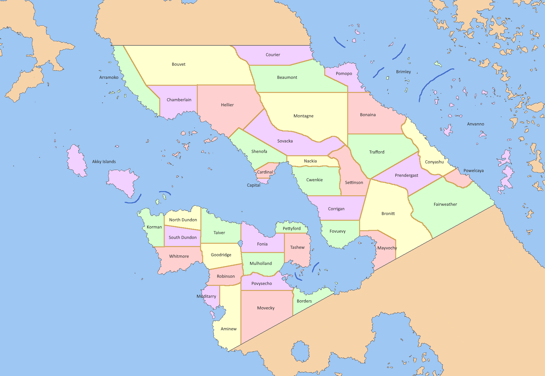 - Map of the Shona Islands. One of the plans I had was for the characters to visit this island nation, but in the end I had more fun making this map than I did coming up with something compelling for them to do there.